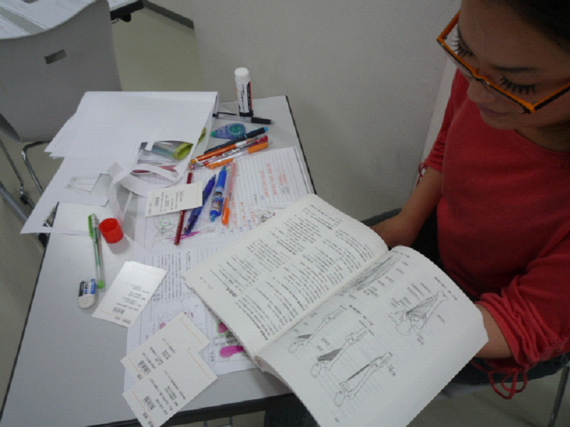 | 放課後の基礎医学実習室の様子です。1年生たちは入学して2週目ですが、毎週おこなわれる解剖学の口頭試問にむけて勉強しています。 |